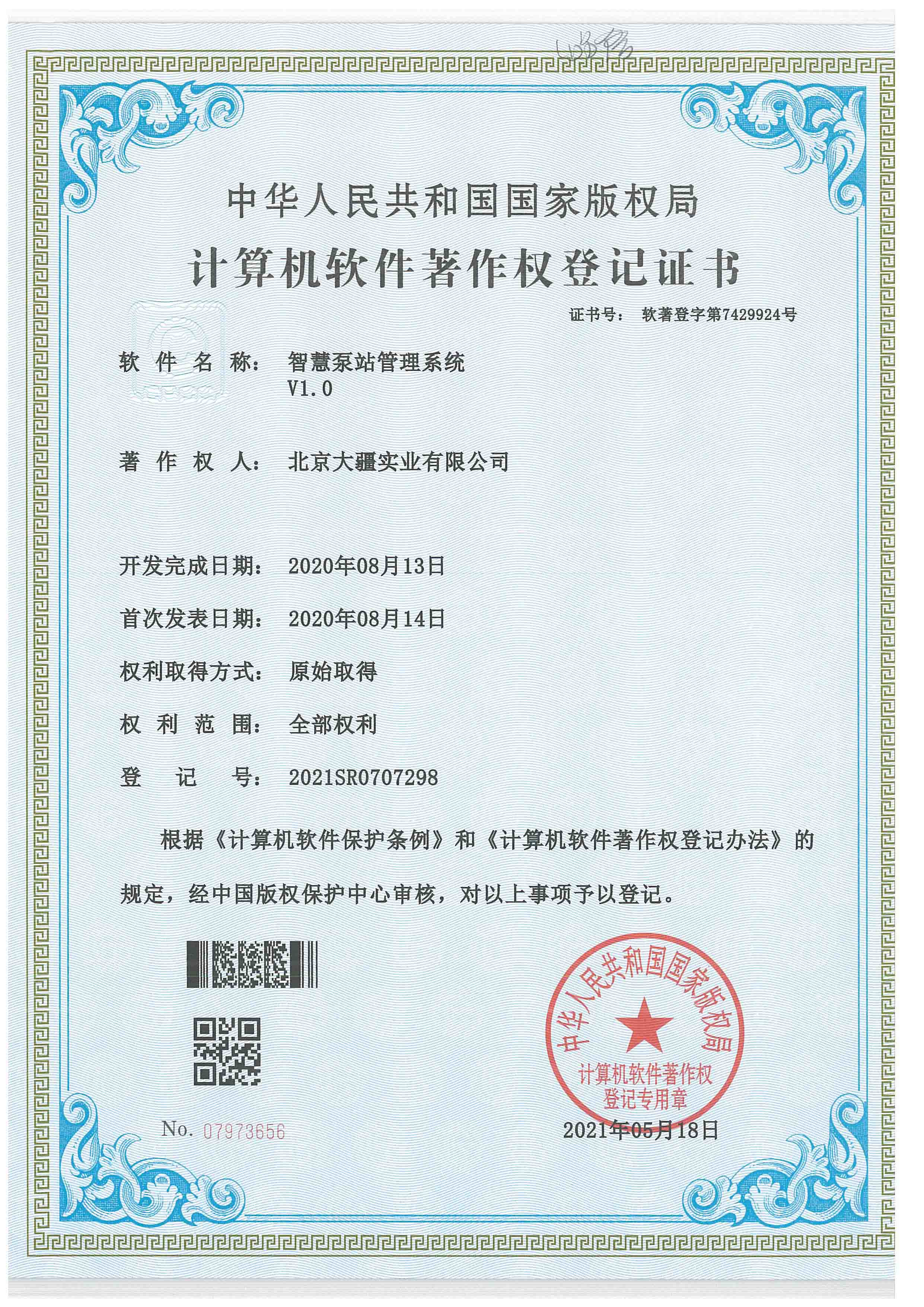 • 智慧泵站管理系统V1.0软件著作权登记证书