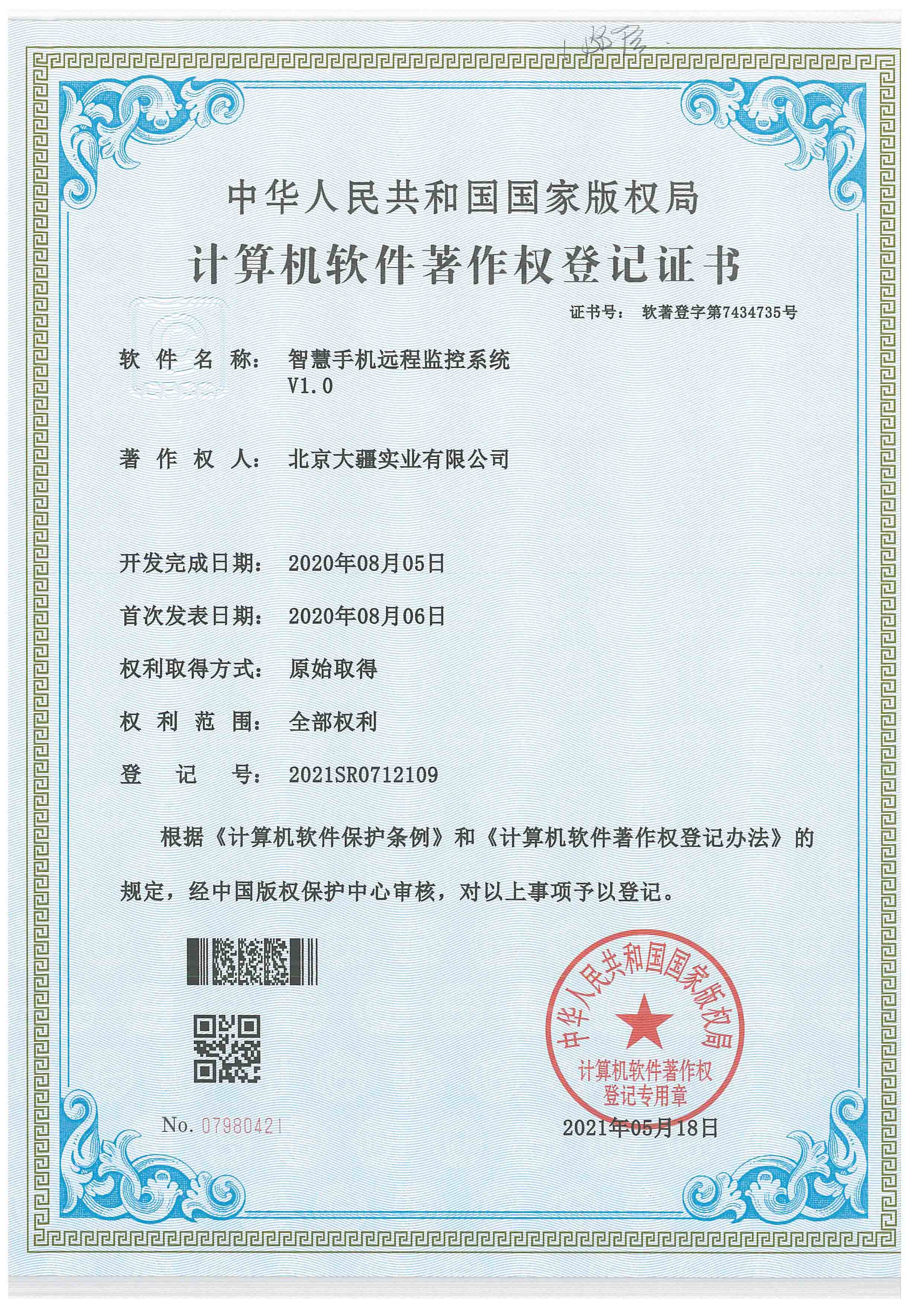 • 智慧手机远程监控系统V1.0软件著作权登记证书
