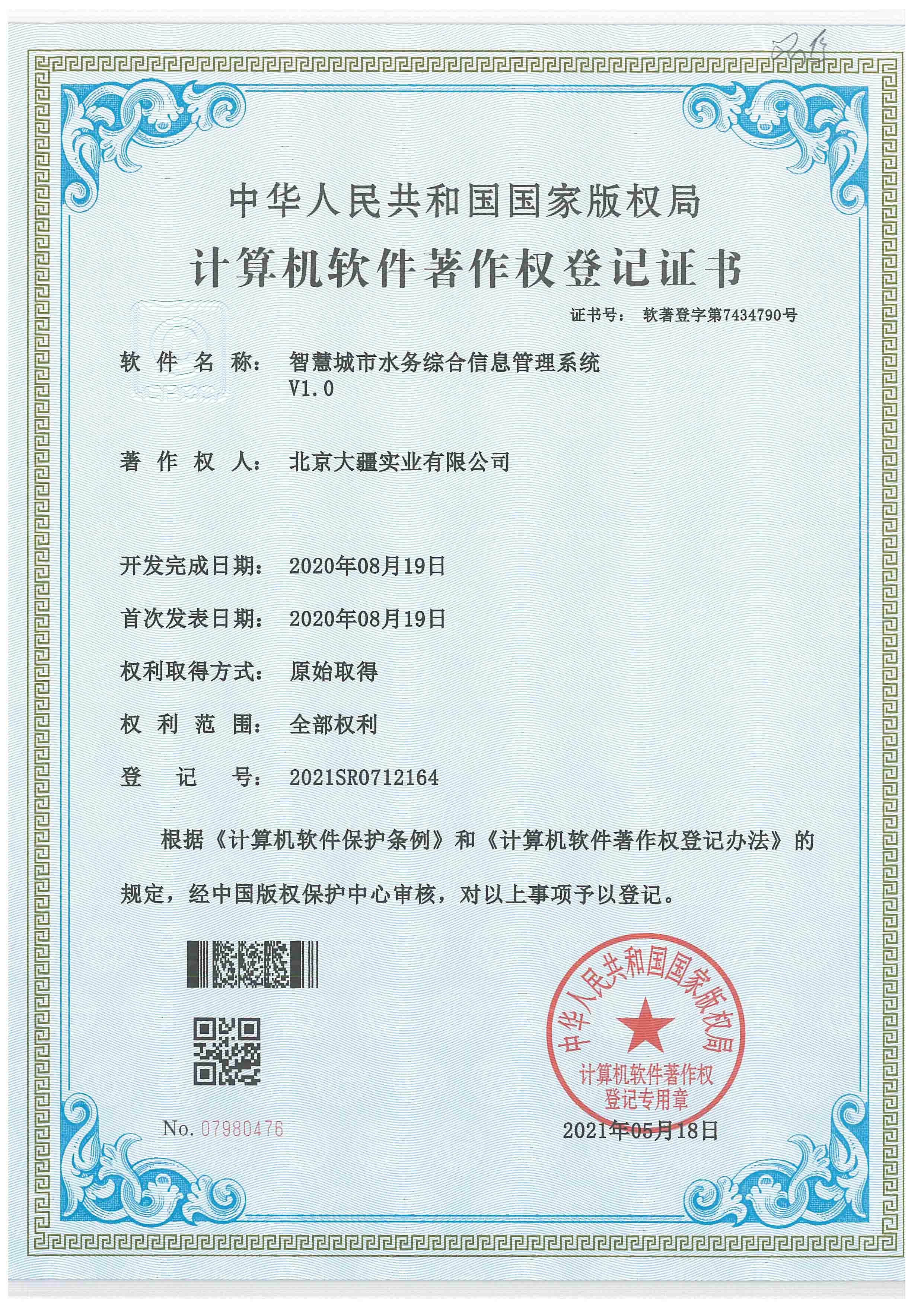 • 智慧城市水务综合信息管理系统V1.0软件著作权登记证书
