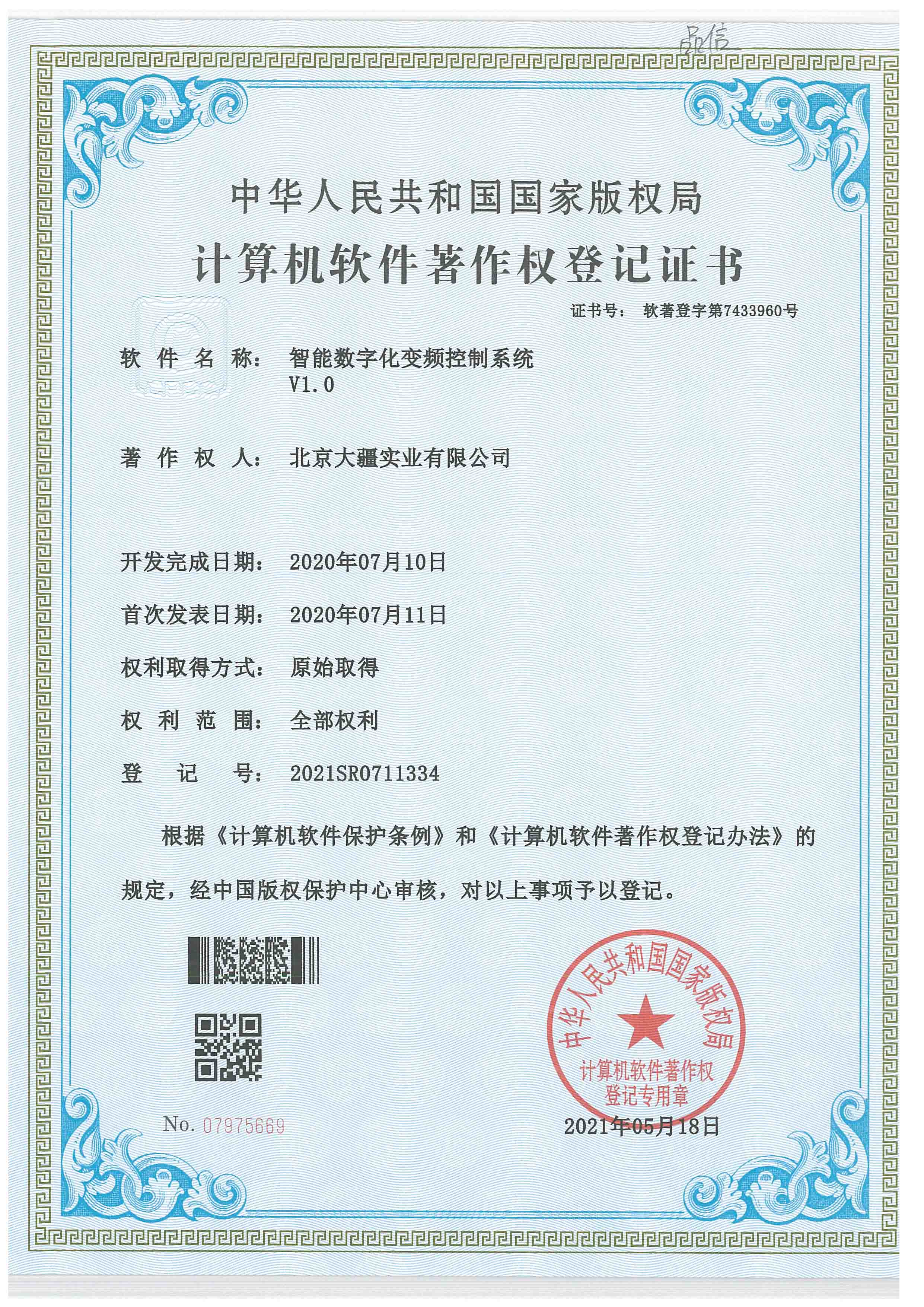 • 智慧数字化变频控制系统V1.0软件著作权登记证书