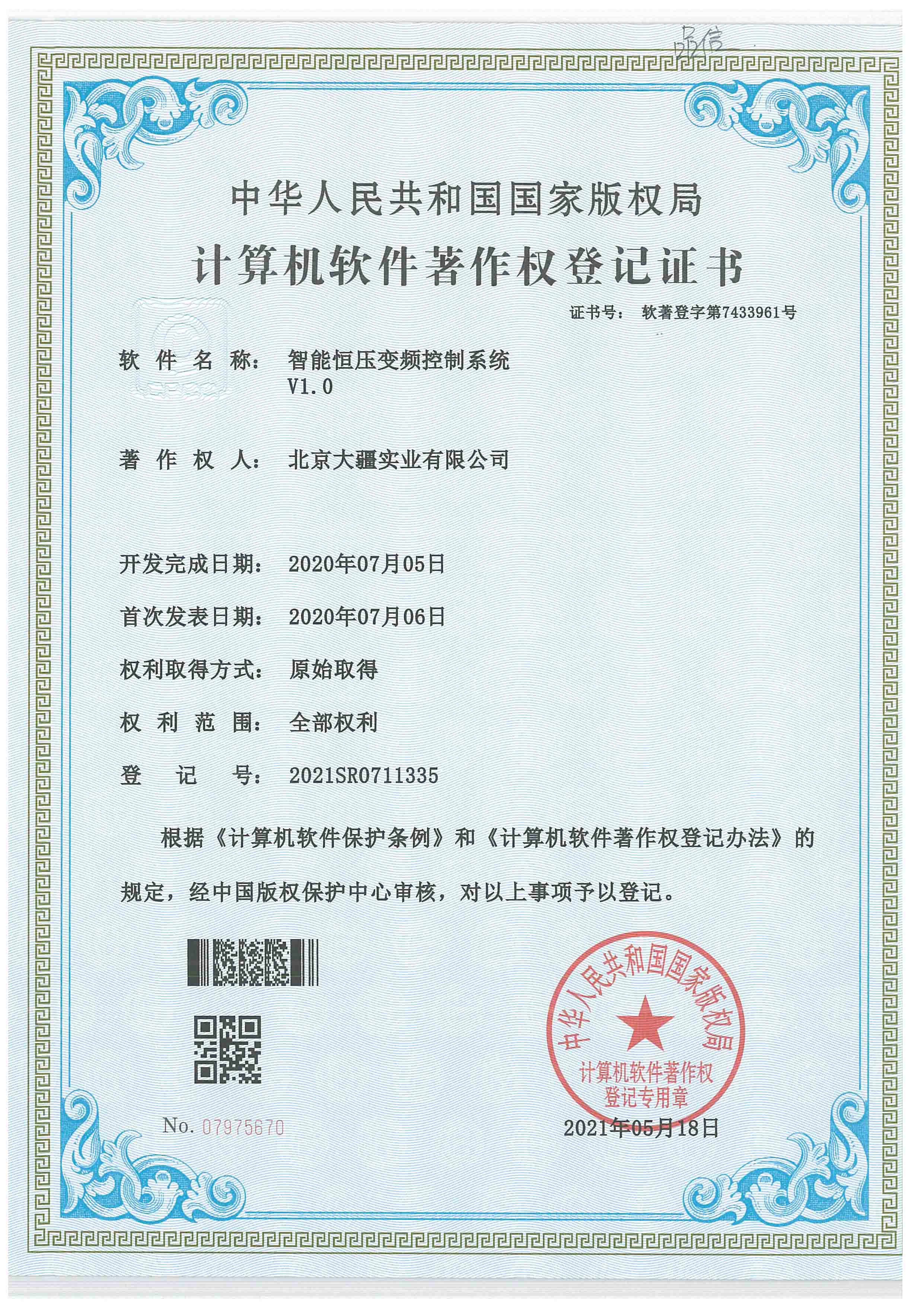 • 智能恒压变频控制系统V1.0软件著作权登记证书