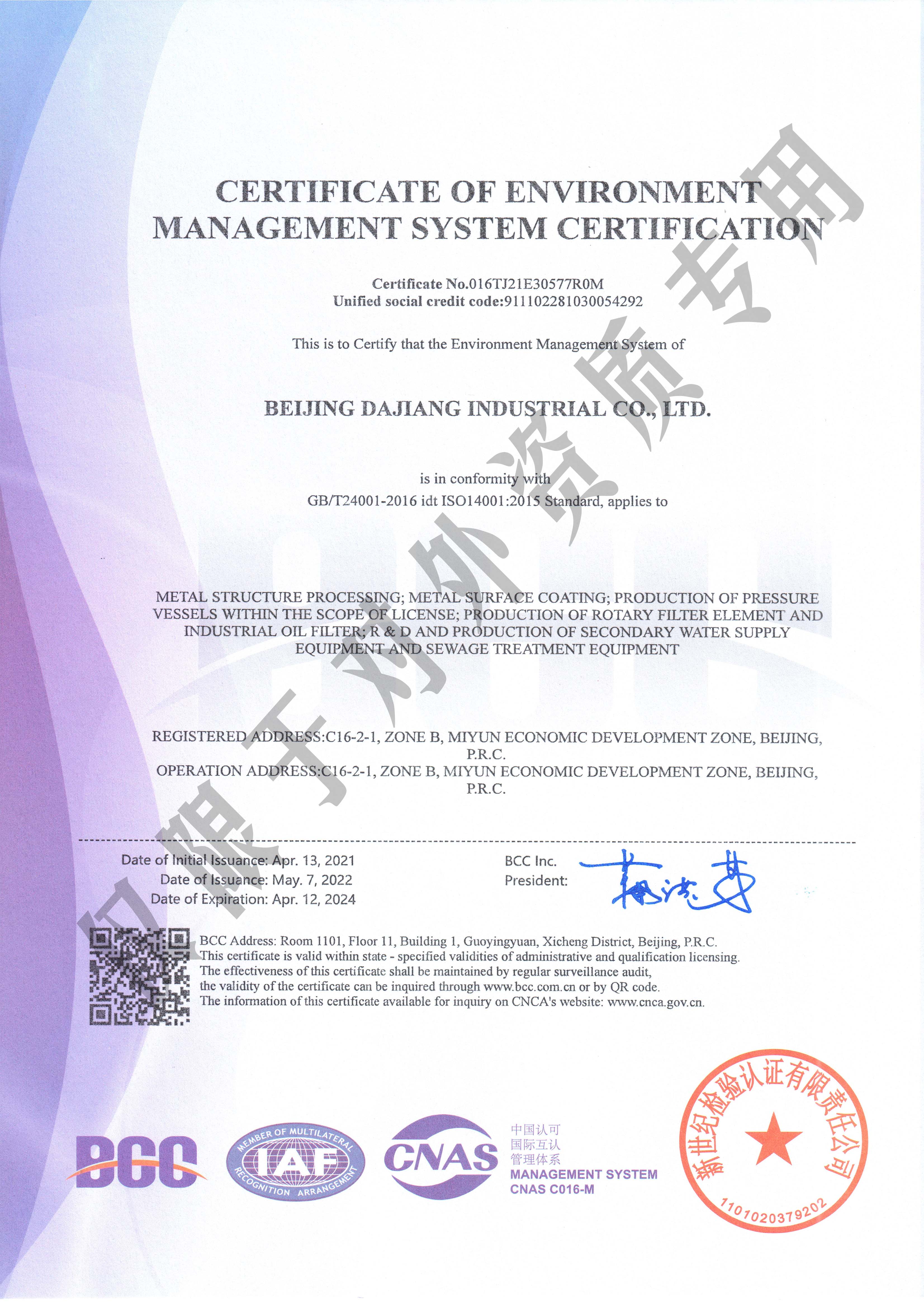 环境管理体系证书-英文