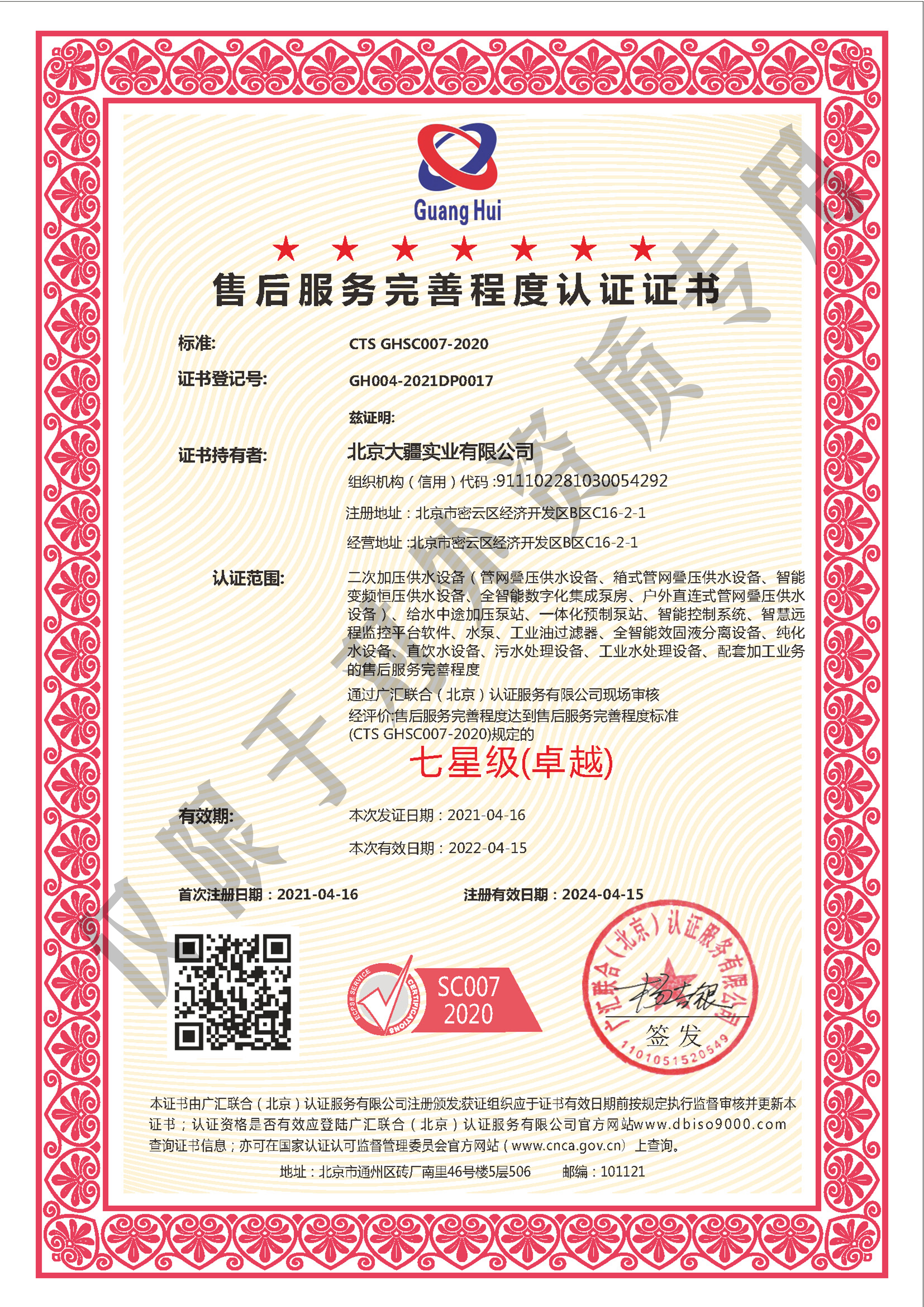 售后服务完善程度认证证书七星-中文